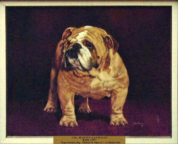 Best of Breed: Ch. Mapo's Sandman (Sandman) N255184. DOB: 01/22/55. Bred/Owned/Handled: Mapo Kennels, Reg. (Richard R. Maze & L. J. (Hinds) Poth) of Houston, TX. By Ch. Santiago De Batangas x Ch. Kapra's Blue Bonnet. Sandman lived nine years and sired 13 champions. Finished with three five point wins from Groups. Won 6 All-Breed BIS, 20 BOB Specialties, 24 Group 1sts and 49 BOB. A limelight win was BOB at the Chicago Bulldog Club Specialty and Chicago International and on to second in Group. He is in the BCA Stud Dog Hall of Fame.