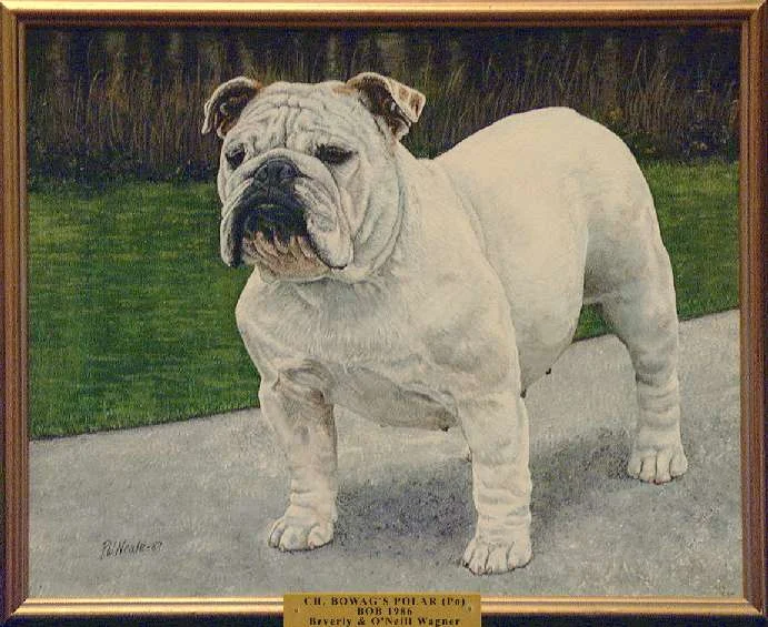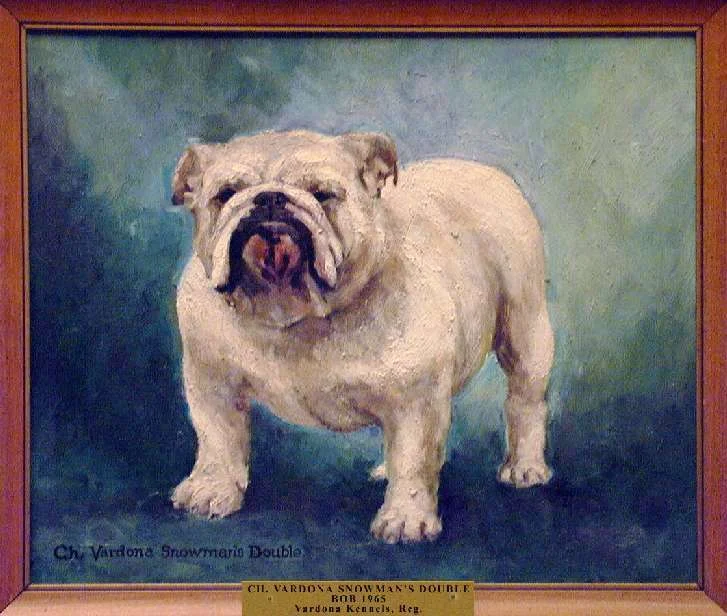 Best of Breed: Ch. Vardona Frosty Snowman (Frosty) N305082. DOB: 08/24/56. Bred/Owned/Handled: Vardona Kennels (Dr. & Mrs. E.M. Vardon). By Ch. Vardona Student Prince x Ch. Twin Shot Limey (1956 BOS). Frosty sired 14 champions and was top winning bulldog and non-sporting dog for 1958, 1959 and 1960. He had 38 BIS, 404 Specialty BOB, 119 Group 1st. Top Bulldog in 1958, 1959 and 1960. He is in the BCA Stud Dog Hall of Fame.
