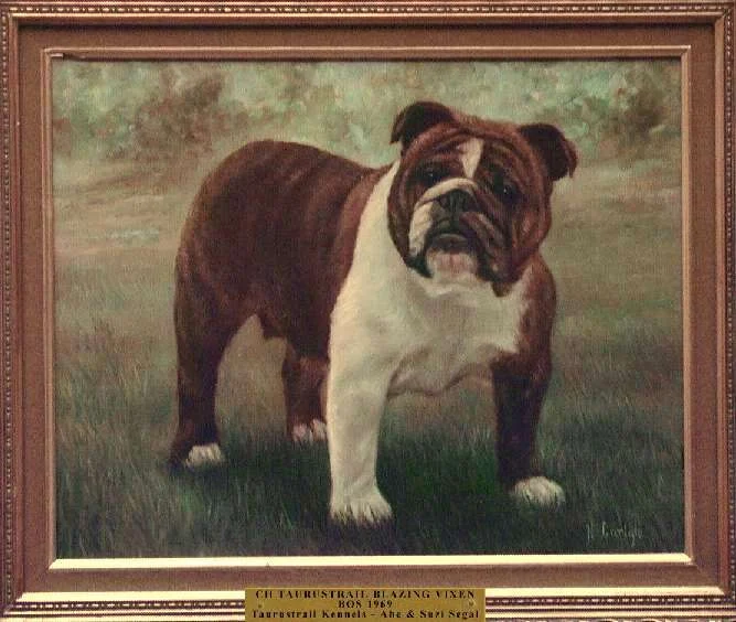 Best of Opposite Sex: Ch. Taurustrail Blazing Vixen (Brownie) NB56569. DOB: 09/15/67. Bred/Owned/Handled: Taurustrail Kennels (Abe & Suzi Segal). By Ch. Taurustrail Tughoat x Ch. Libra Ladybyrd. Finished at 13 months, won 59 BOS (10 at Specialties), two group firsts and some other placings. Brownie was a natural showgirl. I never posed her until the day before her first show. At 7 months she won back to back Bests in Sweepstakes and Best Puppy at Pacific Coast Bulldog Club and Division III Specialties. A year later she won BOB at PCBC over a 100 bulldog entry.
